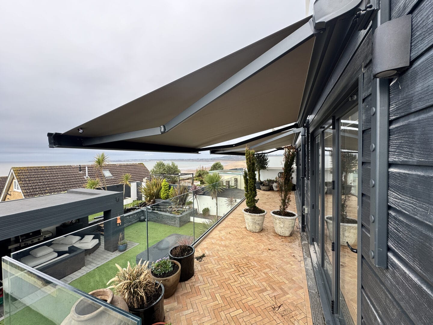 The dark finishings were carefully selected to enhance the home’s contemporary design, adding a refined and high-end aesthetic that blends perfectly with the surrounding environment. With the touch of a button, our clients can now extend their awnings to enjoy their garden and take in their beautiful sea views in comfort throughout the year.